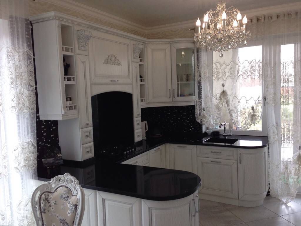 Такая конструкция создаст драматический эффект и станет необычной деталью интерьера, на которую сложно будет не обратить внимание. Кроме того, с помощью люстры черного цвета можно подчеркнуть белоснежный потолок и удачно оттенить все присутствующие на кухне белые поверхности