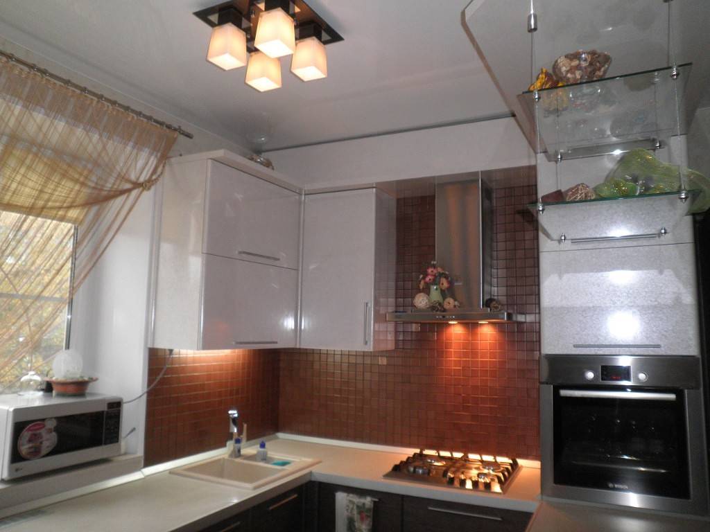 Например, в рабочей зоне необходимо обустраивать отдельную подсветку, которая будет выполнять свои функции в любое время дня и ночи. Под навесными шкафчиками удачно размещаются удлиненные светильники с флуоресцентными или дневными лампами.