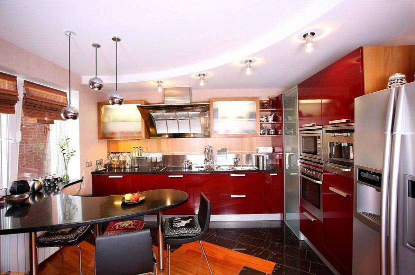 Продумывая освещение кухни с большой площадью, всегда есть где разгуляться. Опытные дизайнеры рекомендуют выбирать для этой цели поворотные точечные светильники. Их можно располагать как по периметру, так и в хаотичном порядке.