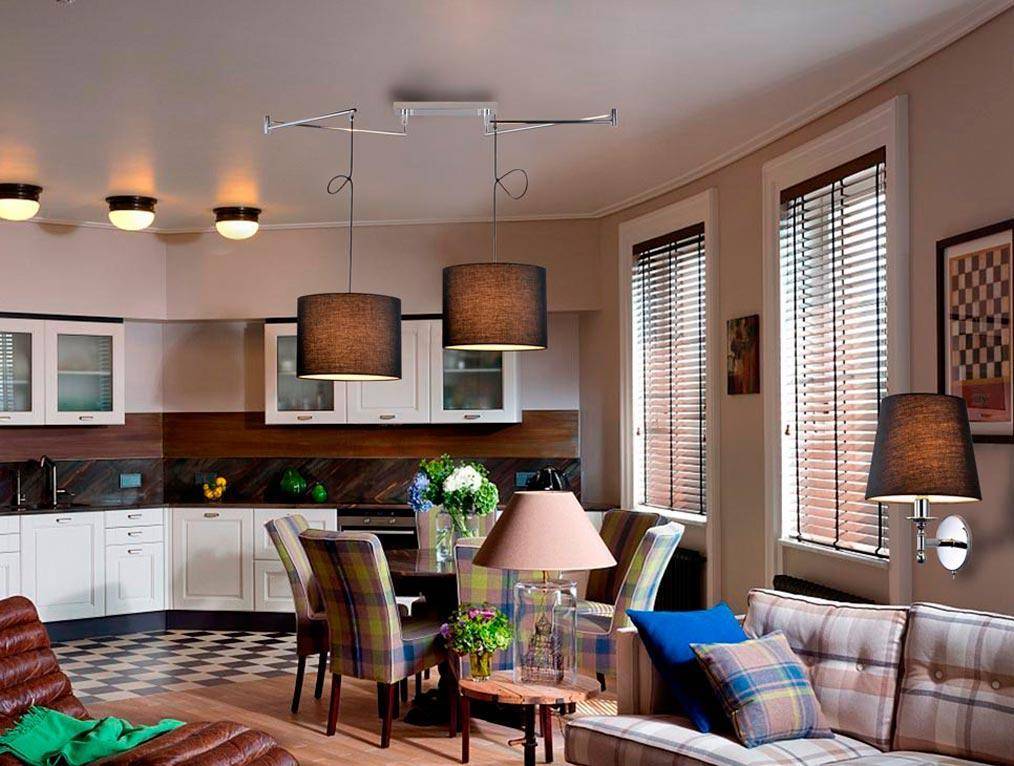 Подвесные люстры — такие конструкции могут состоять из одного или сразу нескольких плафонов, которые крепятся к потолку с помощью цепочки, шнура или струны. Для кухни чаще всего выбирают светильники с абажуром, которые устанавливаются непосредственно над обеденным столом.