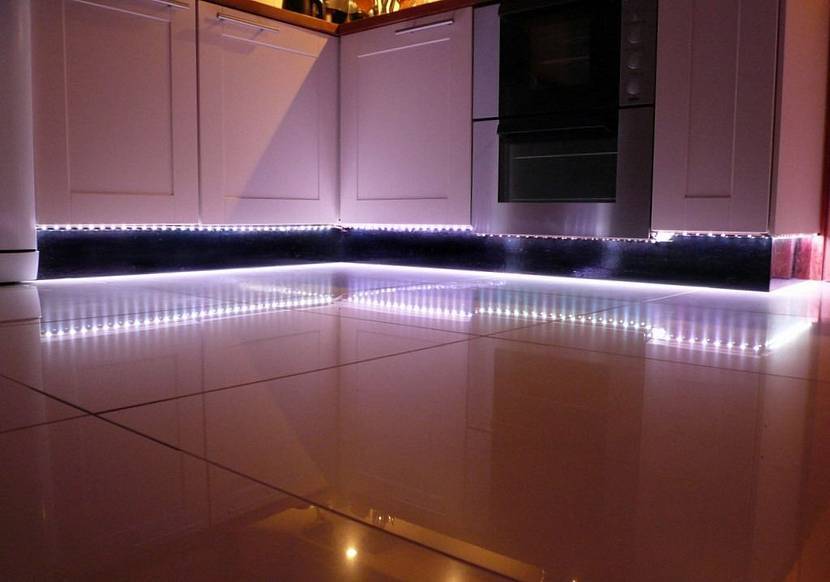 Подсветка из светодиодов на кухне в цоколеИсточник dizainkuhnibest.ru