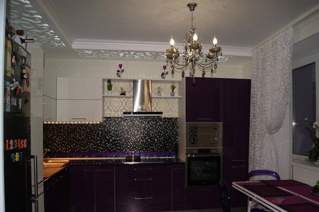 Фиолетовая люстра — необычный элемент интерьера, очень яркий и доминирующий. Выбирать такую конструкцию следует при создании кухни в стиле гламур, барокко, либо восточном стиле. Не стоит злоупотреблять данным оттенком, лучше использовать его в ограниченном количестве, в качестве дополнительного, а не основного оттенка.