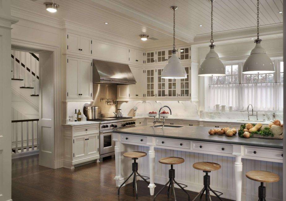 Осветительные приборы часто подбирают под стиль помещения. Так, для строгой классики подойдут подвесные светильники с накладными плафонами. Стилям модерн и лофт больше подходят приборы квадратные или нестандартных очертаний.