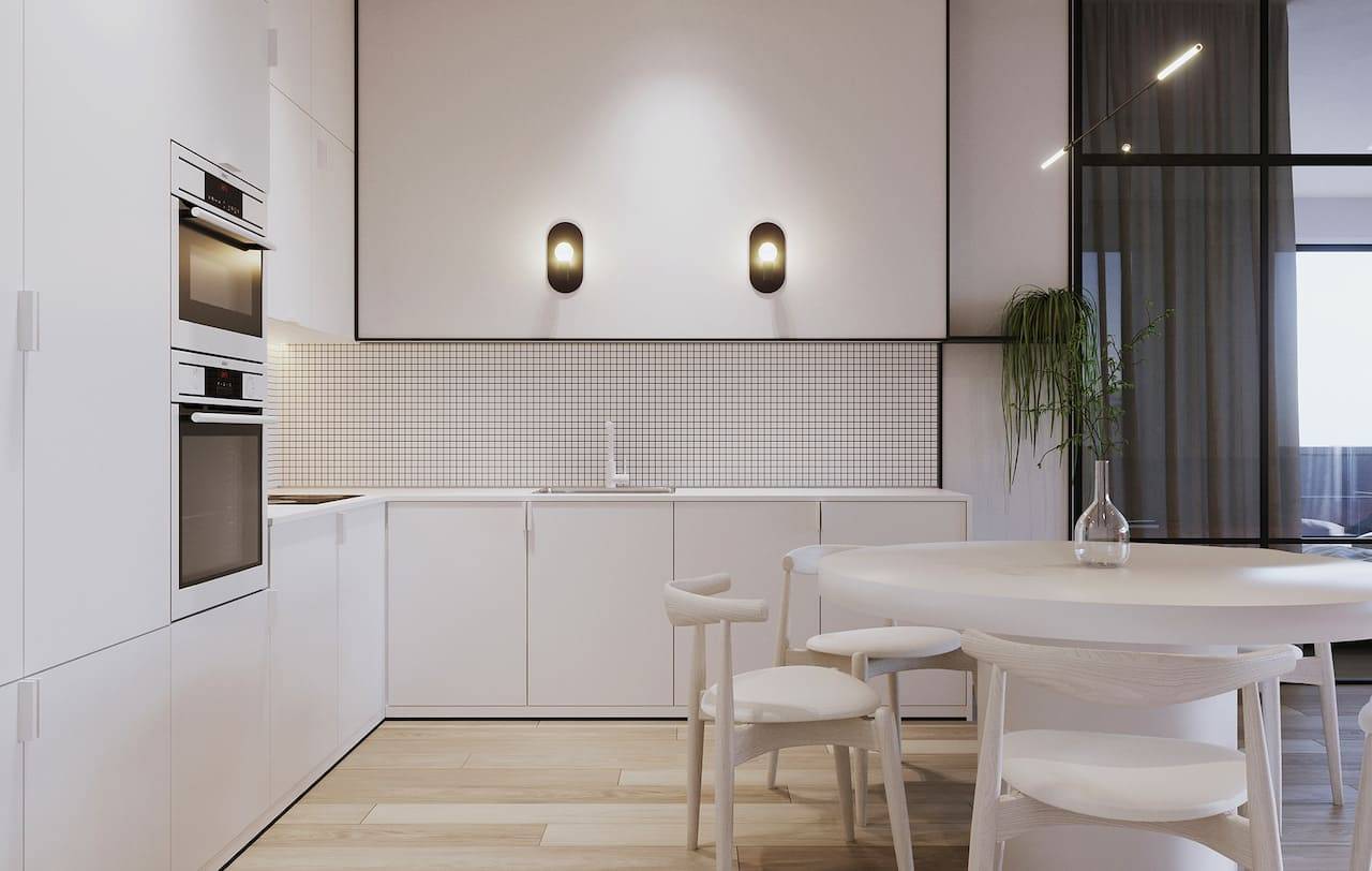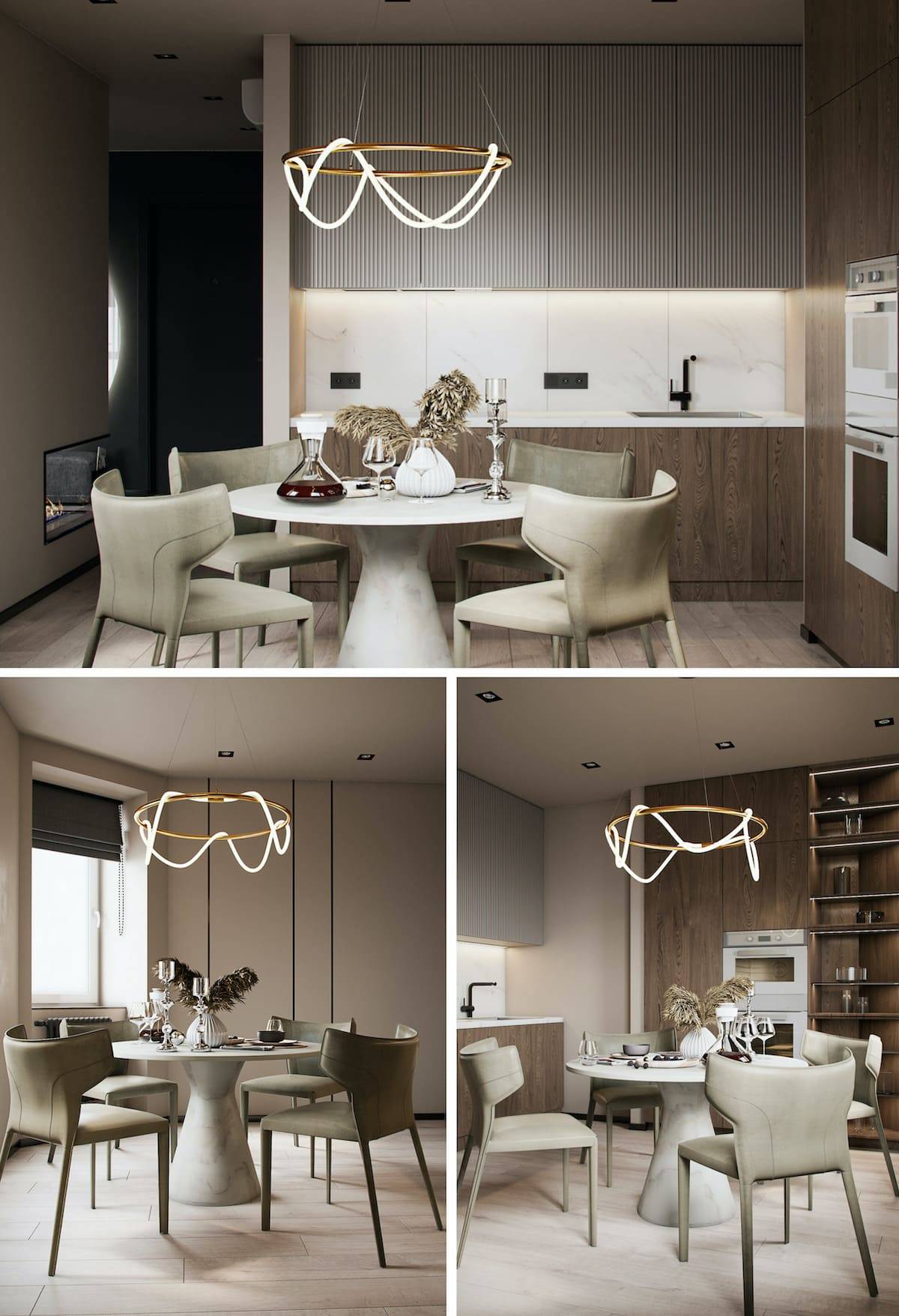 В дизайне популярно оформление с легким налетом роскоши. Немногочисленная мебель и декор сделаны из качественных дорогих материалов. Лаконичный интерьер эффектно дополнит столешница из мрамора или мягкая обивка из кожи. Массивная люстра с позолотой естественно вписывается в скромный минимализм.