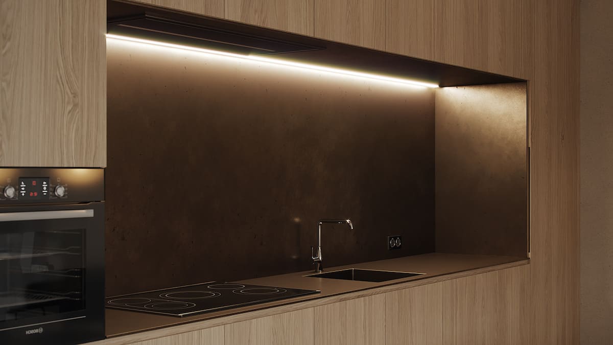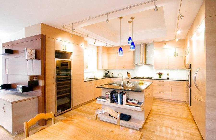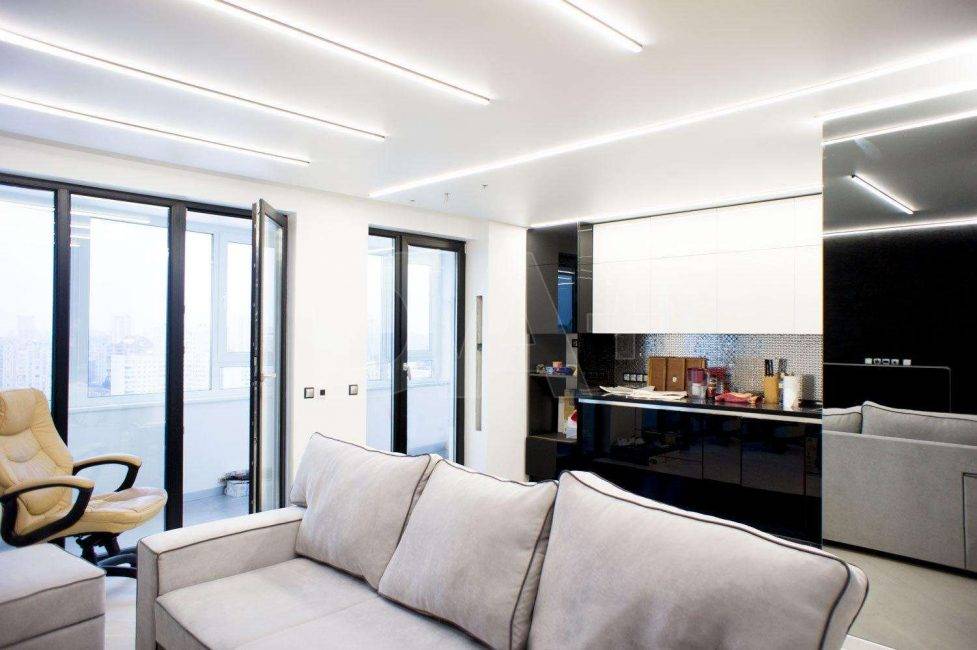 - Для натяжных потолков – комбинированные, используется несколько типов. Светодиоды могут регулировать интенсивность света, зонировать пространство, создавать разнообразные световые эффекты. Например, если рассматривать кухню студию, то на самой кухне можно использовать светильники холодного цвета, а в обеденной зоне теплого.