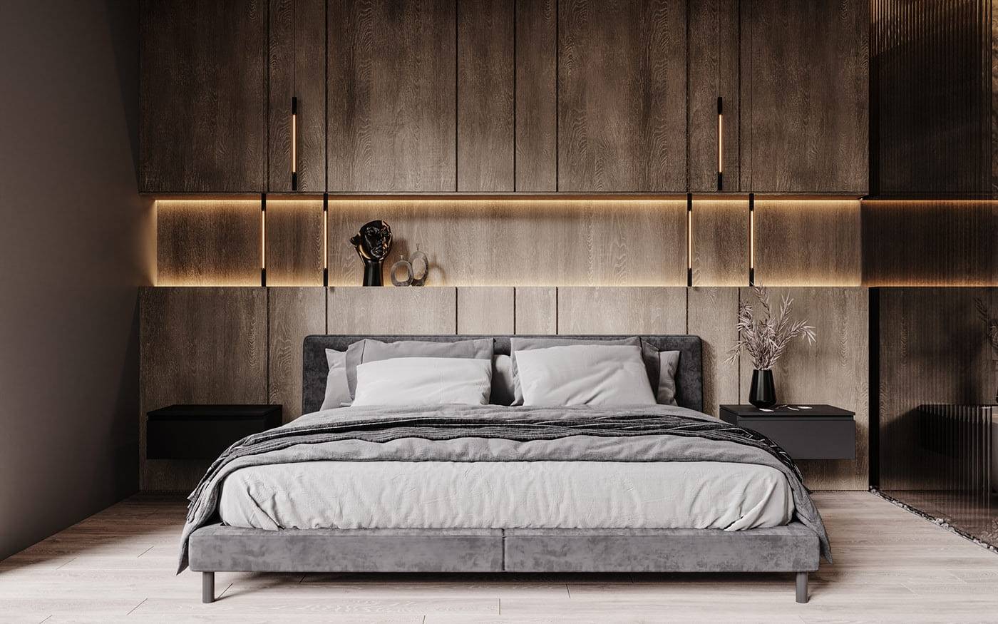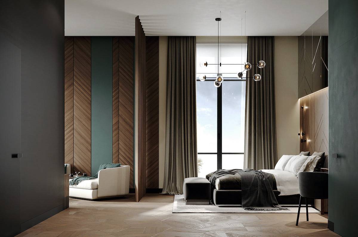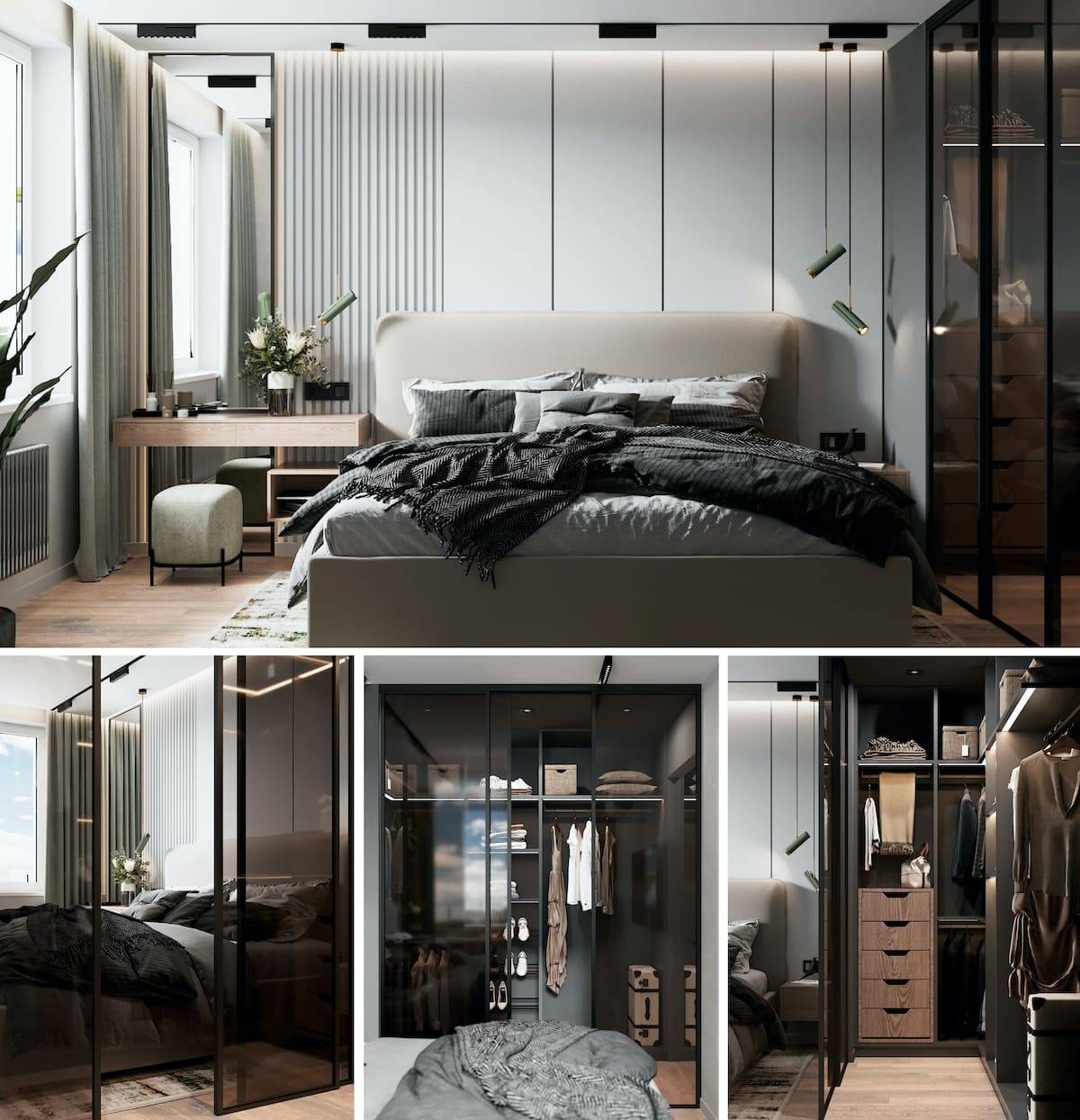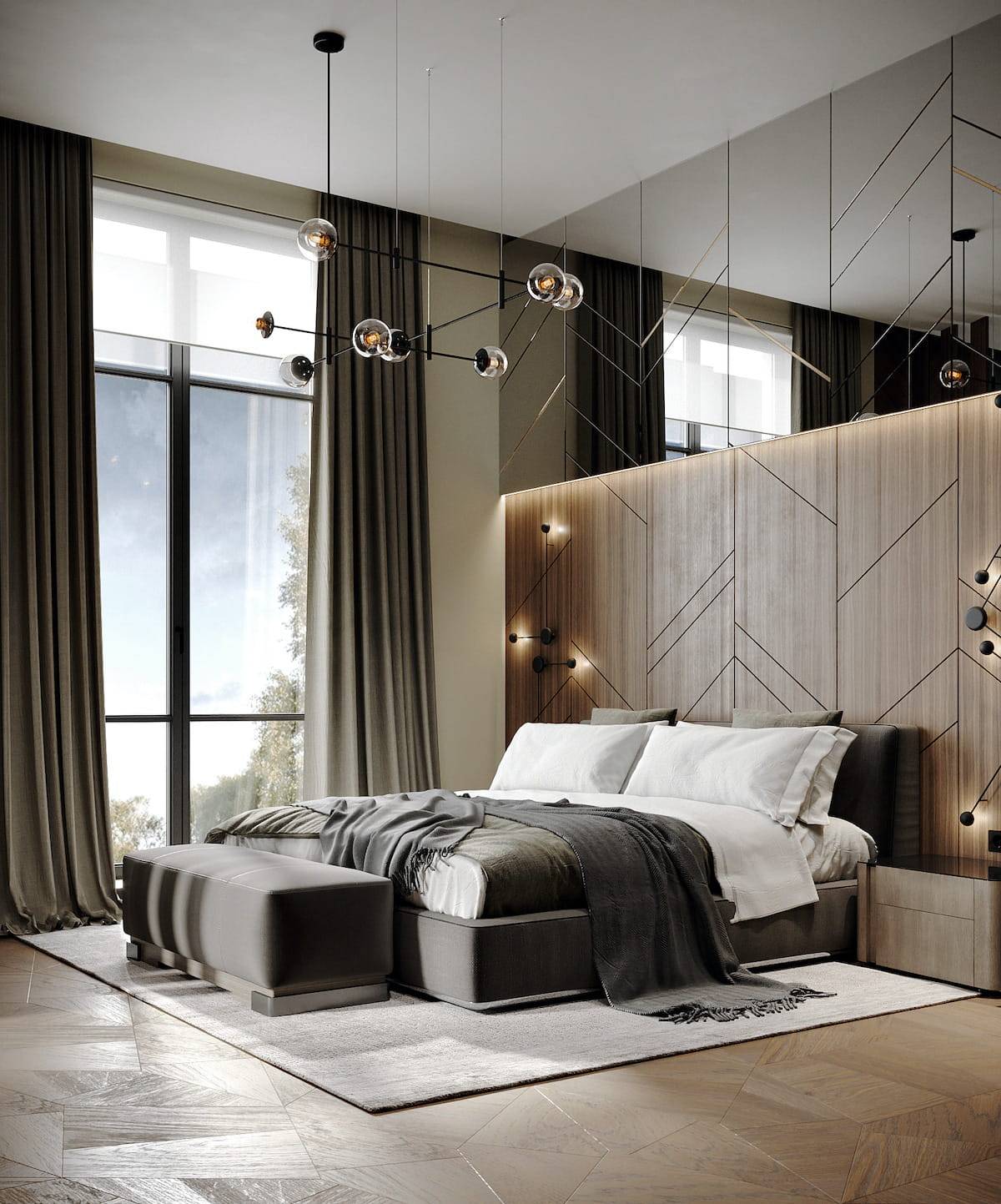 При оформлении стен могут быть применены любые инновационные материалы, но нельзя забывать, что в дизайн спальни 2021 – это сплошной уютно. Конечно, фанаты хай-тека могут проявить техническую фантазию, если это по душе обоим супругам, которые живут в комнате. На фоне легких серых оттенков стен будет хорошо смотреться выбеленное дерево пола, натуральные текстильные акценты изо льна или шёлка.