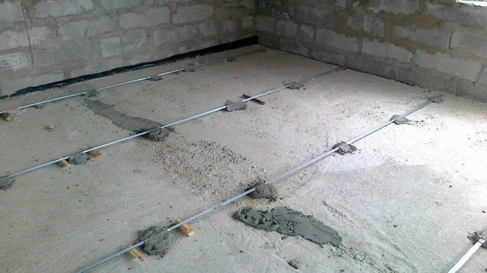 После установки маяков приступают непосредственно к заливке пола, а значит, грунтование пола, работы по монтажу гидроизоляции и прочие подготовительные работы основания необходимо провести заранее.