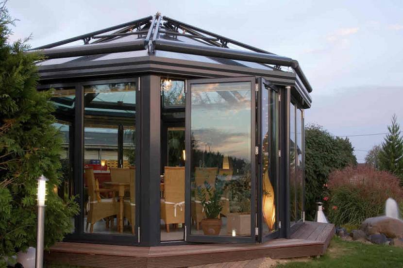Беседка из пластиковых окон. Эта нестандартная конструкция разрабатывается под конкретного заказчика и выполняется в индивидуальном порядке. Боковые панели представляют собой раздвижные системы, которые напоминают конструкцию шкафа-купе. В качестве кровельного материала чаще всего используется гибкая черепица. Этот вариант относится к категории класса люкс, поэтому и стоимость его соответствующая – самая простая беседка из окон на 8 кв. м обойдется не меньше чем в 200 тысяч рублей.