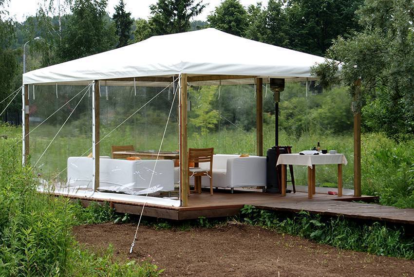 Поливинилхлоридная пленка используется круглогодично, комфортна в летний период, во время дождя, защищает от ветра. Беседка защищена, кроме дождя, еще и от снега зимой.