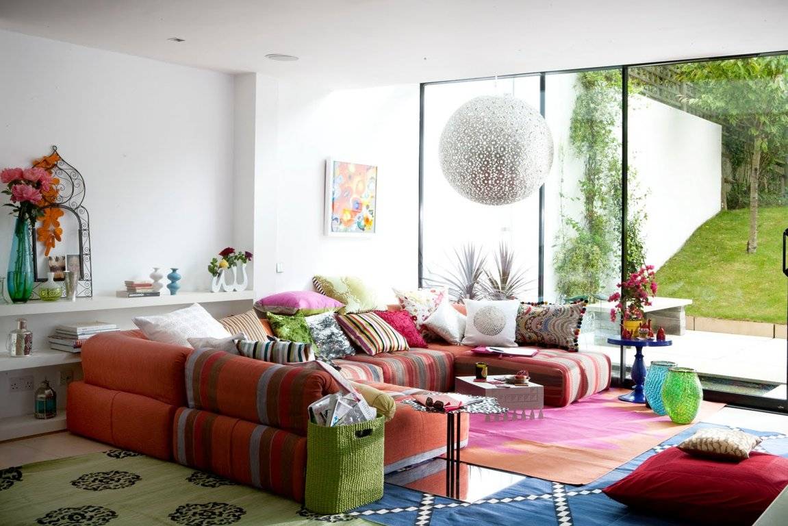Яркие акценты в виде подушек, ковров на полу или мебели будут отлично сочетаться с нейтральной отделкой стен в светлых тонах или же кирпичной стеной