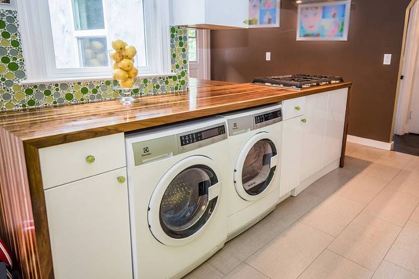 Кухня со стиральной машинкой часто оборудуется общей столешницей. Под общую столешницу можно установить только машину с фронтальной загрузкой. Её можно расположить в одном ряду с кухонной тумбой, мойкой и духовым шкафом. Если рядом с машинкой стоит духовка, необходимо предусмотреть надёжную теплоизоляцию стирального автомата от горячего духового шкафа.