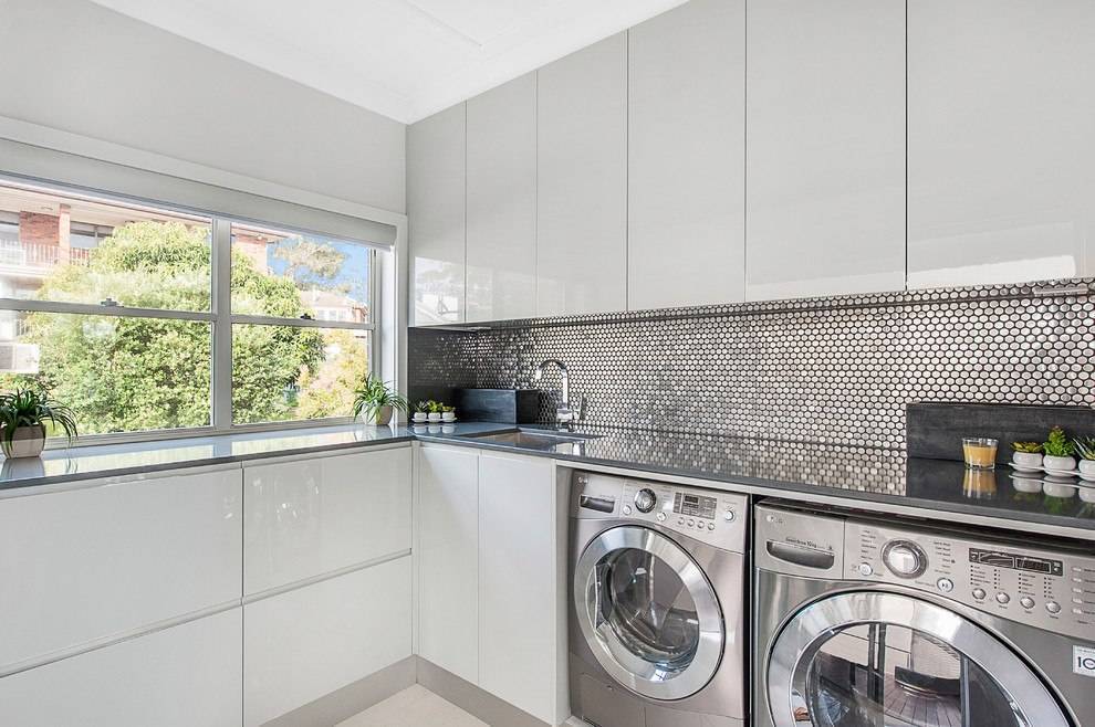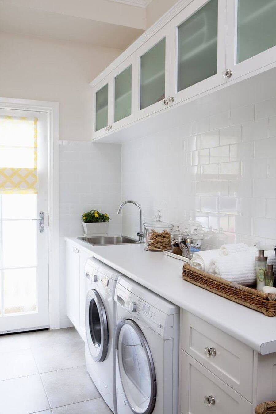 Уникальная идея: Если помещение позволяет, поставьте в высокий шкаф и стиральную, и сушильную машины друг над другом. Оформите его один в один с холодильником – подобная симметричность сейчас в моде.