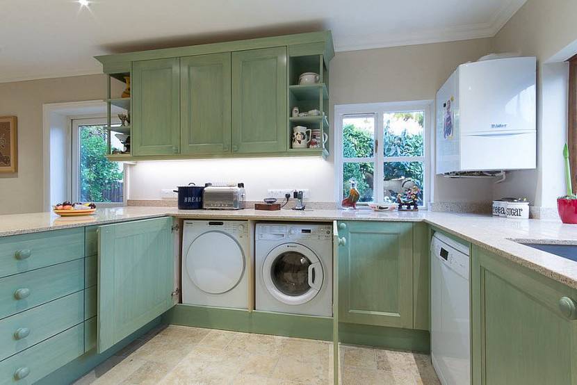 Стиральная машина в интерьере кухни может быть установлена следующим образом: