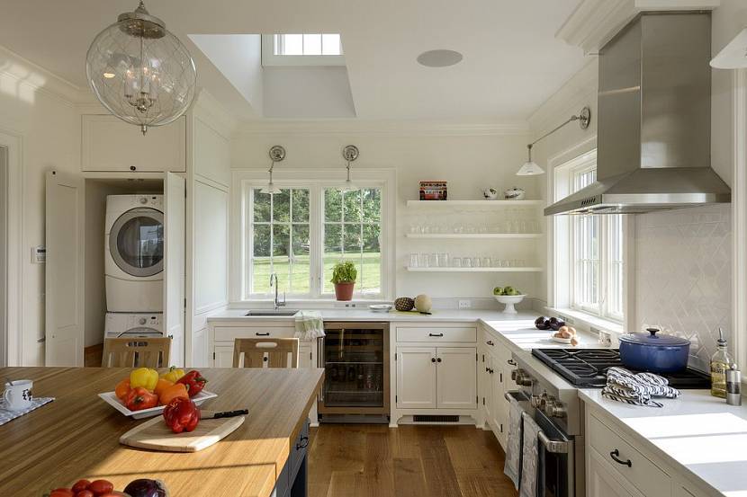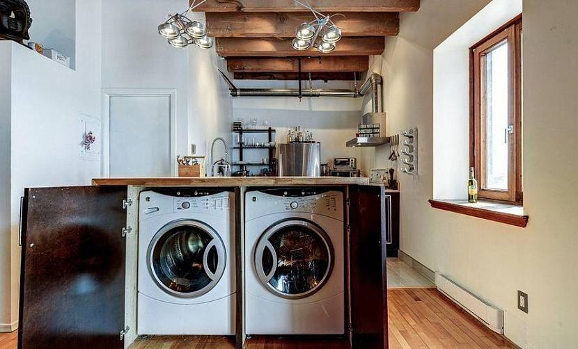 Если помещение отличается большими размерами, то машинку можно даже не скрывать, оставляя ее как отдельный элемент интерьера, а вот когда приходится экономить пространство, то важно продумать все возможности размещения прибора: