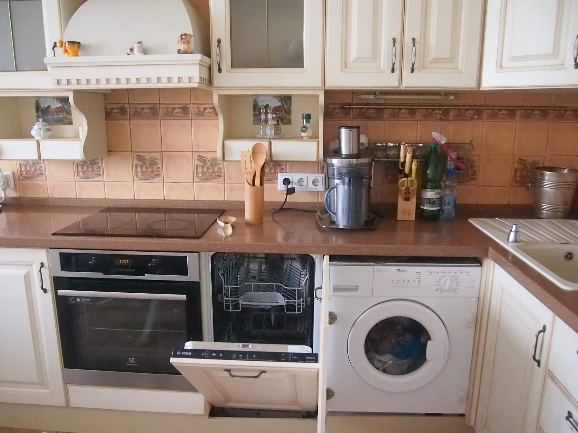 Когда в ванной комнате не хватает места под стиральную машину, то ее часто размещают на кухне. Расположить ее можно в любом месте кухни. Наиболее комфортный вариант – под столешницей или в шкафу с дверками.