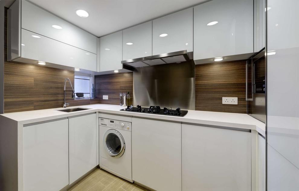 - в небольшом помещении оптимальным вариантом будет угловая кухня с расположением умывальника в углу. При этом стиральную машину устанавливают в соотношении 2:3 с остальными устройствами или симметрично относительно самого угла. Первый вариант подойдет для холодильника, второй – для духового шкафа;
