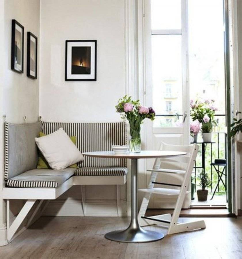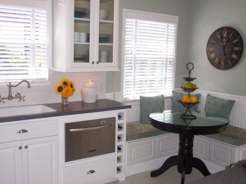 Чаще всего маленькая кухня имеет такой предмет мебели. Все потому, что стулья негде поставить, а угловая скамейка с мягкими сиденьями вписывается туда как нельзя лучше.