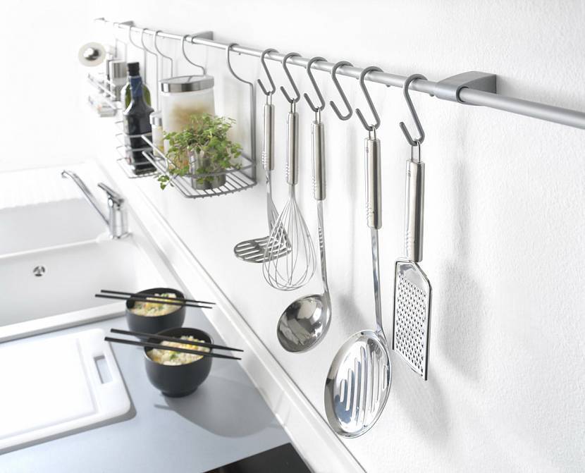 Рейлинги – открытая система хранения для подвесных кухонных приспособлений:
