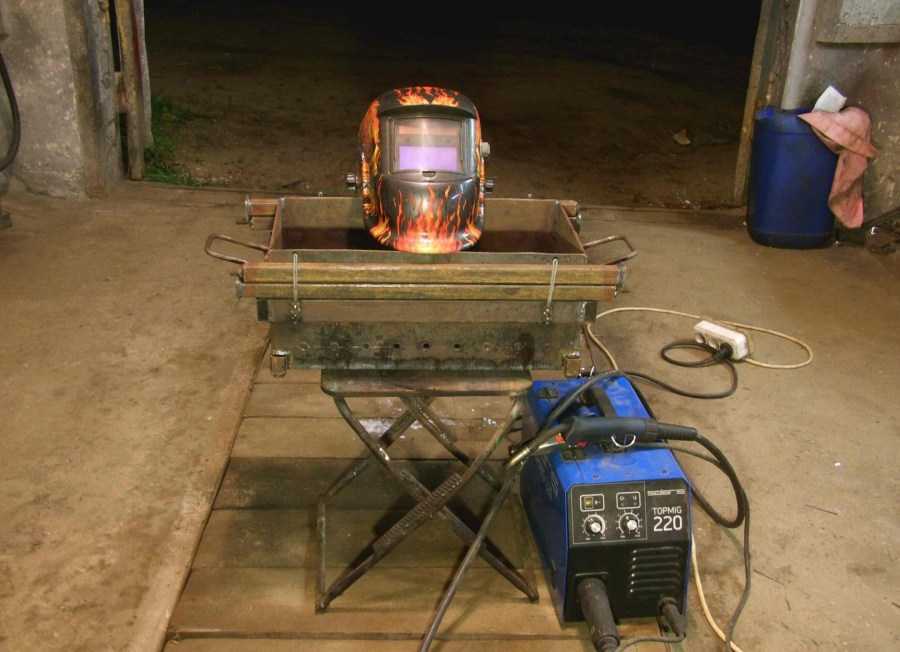 - сварка из металлических деталей – обычно изготавливаются опорные конструкции, на них крепится жаровня, при необходимости сооружается крышка, дымоход и навес.