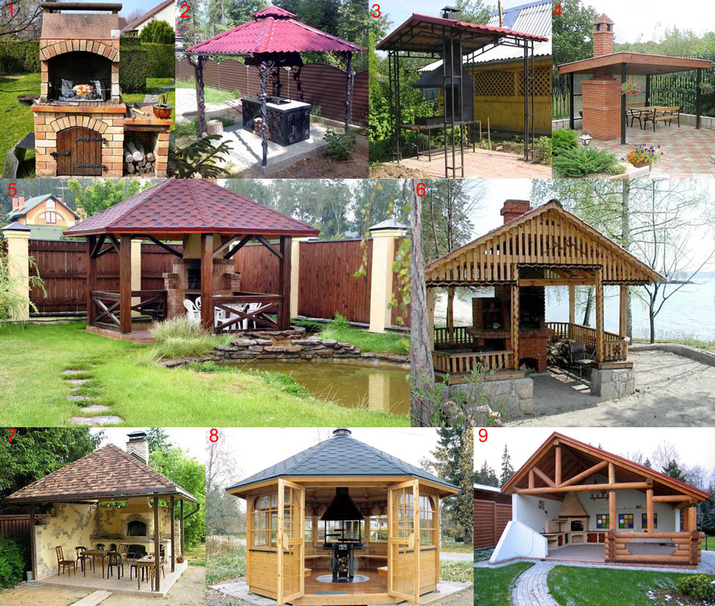 У вас, возможно, уже назрел вопрос – а как же такие уютные садовые сооружения, как фитобеседка и пергола? Что касается не увитой растениями перголы, то оставьте навес с плоской крышей без кровли, вот и будет пергола. Но соседство мангала или печи с любыми фитопостройками действует на последние губительно. Так что рассмотрим, в порядке возрастания сложности, стоимости и трудоемкости устройства то, что возможно.