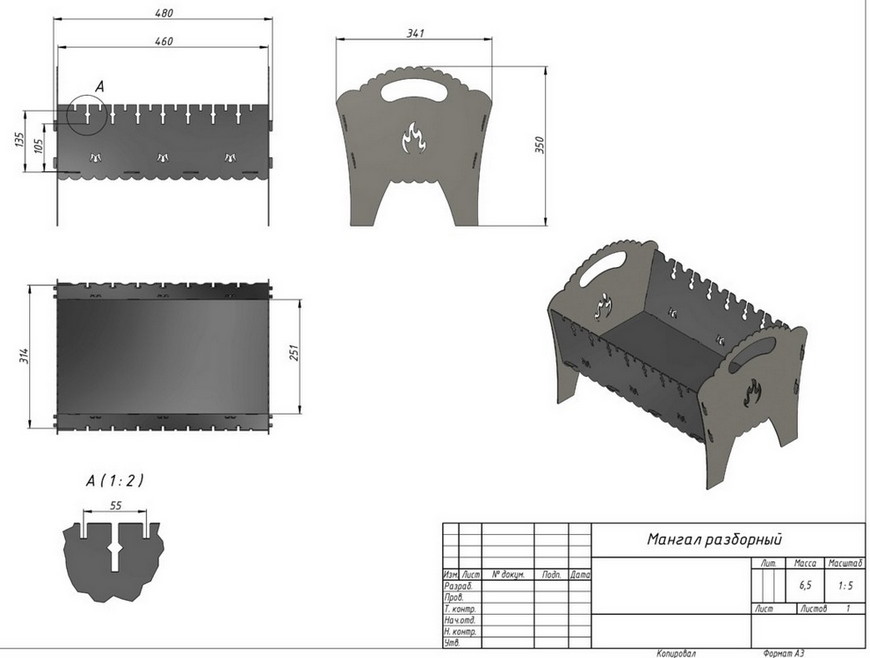 Разборные мангалы производятся с использованием листогиба. Лучше всего изготавливать из нержавеющего металла и покрывать жаропрочной краской. Мангал простой в изготовлении и использовании.