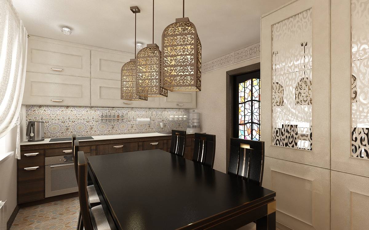 Мебель для кухни в марокканском стиле подбирают с резными элементами. Также кухонный гарнитур может иметь плавные изогнутые линии и стрельчатые узоры. Особую атмосферу востока для интерьера кухни придаст столешница с марокканской плиткой из камня или керамики.