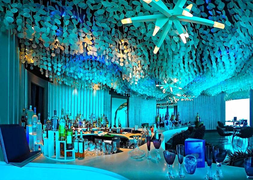 Да и сам бар прекрасно вписывается в тему подводного мира. С потолка свисают тысячи ракушек, светильники выполнены в виде морских звезд, а дизайнерские кресла напоминают морских ежей. Каждую среду и субботу здесь устраивается световое шоу, и тогда океанская пучина выглядит еще красивее. Ланч с бокалом вина обойдется в Subsix приблизительно 165$.