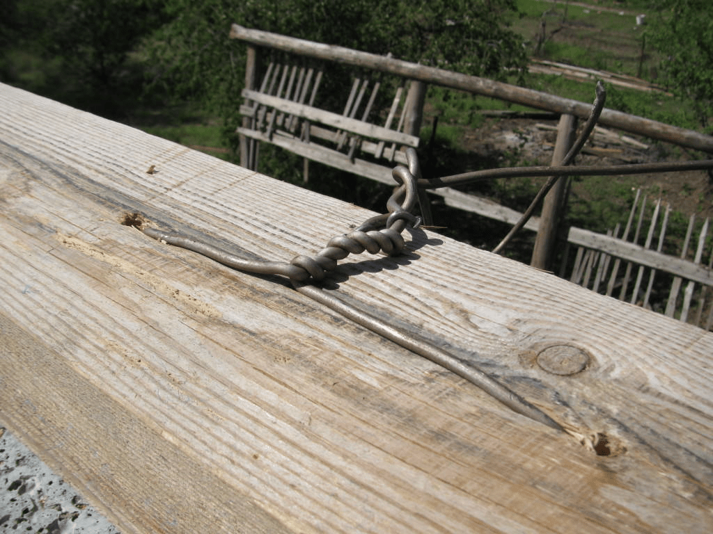 Перед тем как закрепить мауэрлат, проволоку нарезают и отжигают, чтобы сделать ее более мягкой и пластичной. Материал пропускают в отверстие и заворачивают на угловой кромке мауэрлата с помощью монтировки, оставшиеся усы отрезают ножницами.