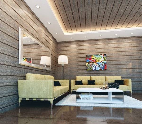 - Кроме этого, в комнатах, которые объединяют зону отдыха и столовую, можно сделать комбинированную обшивку панелями по горизонтали. Снизу до половины стены разместится материал темного цвета, а сверху – светлого. Чтобы скрыть места между переходами цветовой гаммы, рекомендуется установить дополнительный декор из деревянной планки. Интересно также выглядят в гостиных стены, которые обшиты панелями вертикально от пола до потолка. Благодаря тому, что материал, прикрепленный к основанию, приобретает планочную структуру, поверхность получается полосатой, в результате чего пространство визуально расширяется.