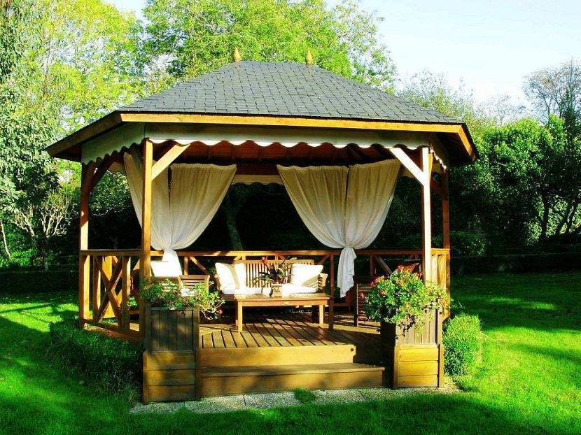 Беседка часто устанавливается в солнечном месте – подбирая материалы для стола и лавочек это надо учитыватьИсточник realsroier.ru