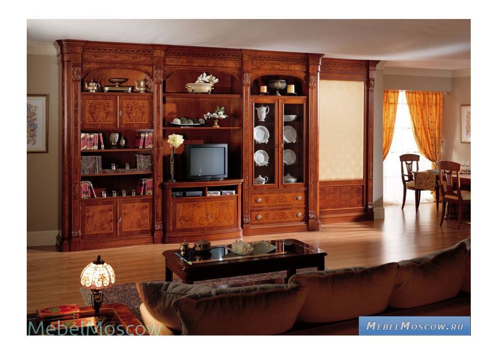 Натуральное дерево. Наиболее надежный и дорогостоящий материал. Его цена зависит от многих факторов, среди которых разновидность породы и профессионализм мастера, изготавливающего угловые, прямые или модульные горки для гостиной. Чаще всего мебель делается на заказ. Ее основные преимущества – долговечность, надежность и роскошный внешний вид.