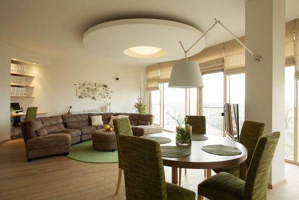 Круг не обязательно должен располагаться в центре комнаты. Больше распространены даже варианты, когда в одной комнате обустроено сразу несколько таких мебельных кругов, ни один из которых не расположен в центре комнаты. Они могут иметь совершенно разные стилевые и декоративные особенности. Однако для этого нужно достаточно большое помещение.