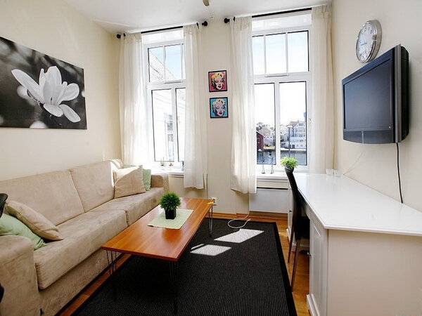При ограниченности материальных ресурсов желательно выбирать лаконичную мебель сдержанных тонов. Дополнительный шик ей могут придать декоративные элементы с аксессуарами (подушки, плед).