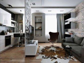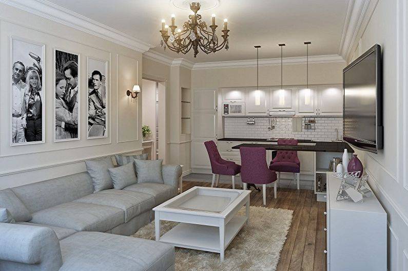 Еще одна интересная идея — сочетание белого и серого. Аксессуары и мебель этого цвета отлично смотрятся в гостиной-кухне, где преобладающим оттенком является белый. Это великолепная комбинация для небольших пространств. На самом деле, комната может быть даже очень маленькой, но белый на стенах, а также на мебели придаст гостиной-кухне дополнительное измерение.