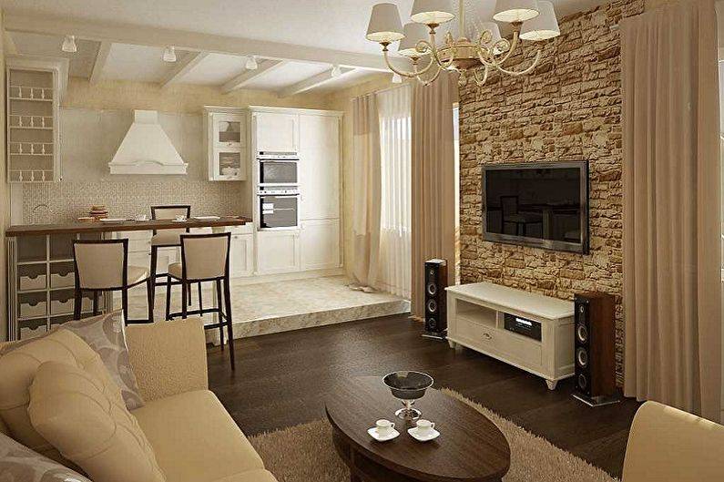 Деревенский стиль привносит в зал ощущение домашнего уюта. Для интерьера характерны побеленные стены, фасады мебели и пастельные цвета (лаванда, роза) в декоре. Нарочитую небрежность отделки легко скрыть под светлыми оттенками. Чтобы комната не выглядела обезличенной, используют акценты в украшениях.