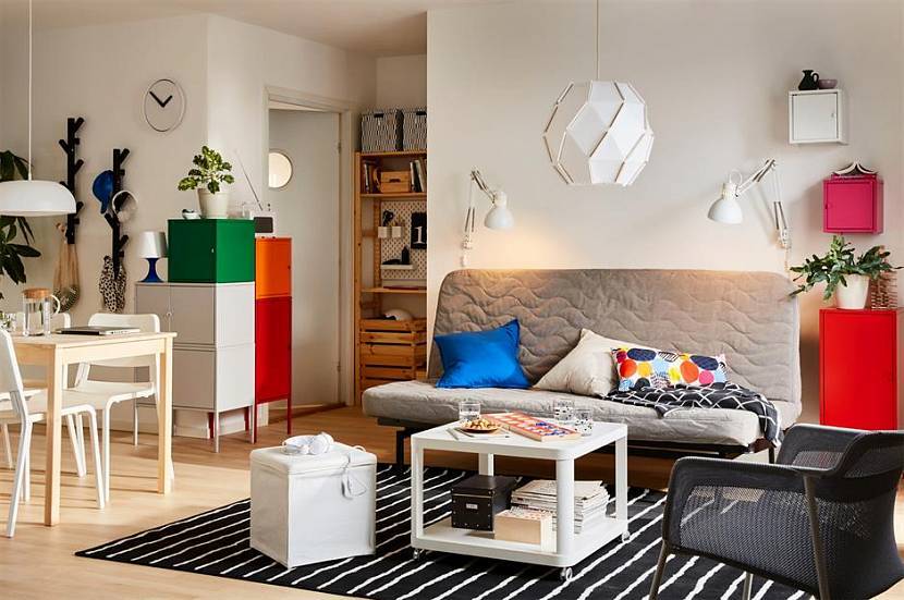 Большие цветовые модули мебели, добавленные в обстановку, имея сдержанный дизайн, не задавят свободное пространство, что немаловажно для комнат с ограниченной площадью