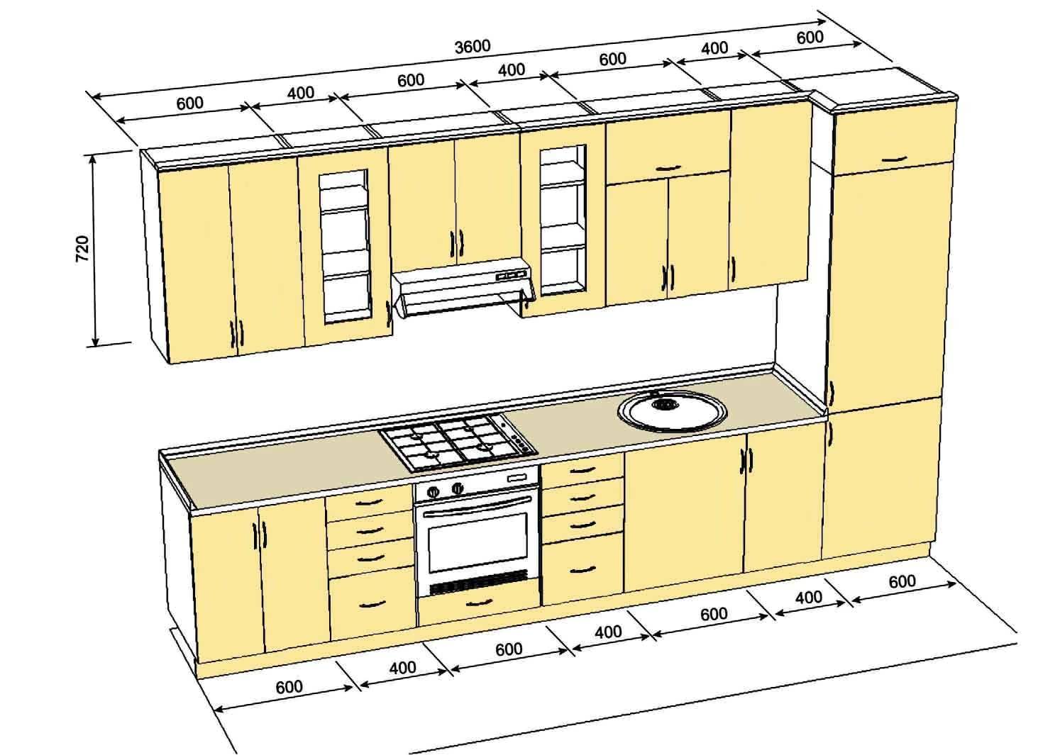 Во время создания схемы будущей кухни важно учитывать пожелания домочадцев, рост хозяйки, функциональность и эргономичность мебельного гарнитура. На эскизе отображаются габариты тумбочек, шкафов, полок и ящиков, фасадов