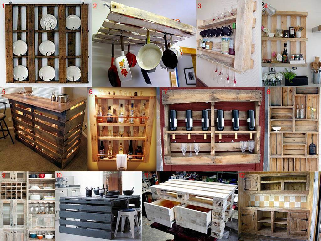 Стеллаж из паллет (поз. 8) особого столярного мастерства не потребует, но понадобится полная разборка поддонов. Как ее упростить и облегчить, также см. далее. Полученного качественного материала столяру-любителю будет достаточно для изготовления, напр., кухонного шкафа с винным погребком или кухонного гарнитура. «Фишка» здесь в том, что материал бросовый: вдруг что не вышло сразу, поддоны – не мебельный массив по 3500 и более руб. за кв. м.