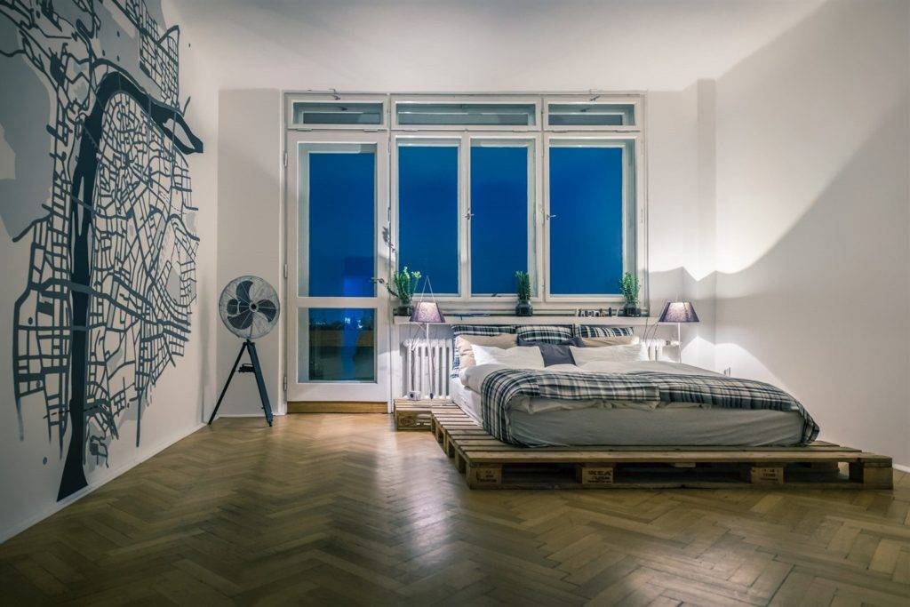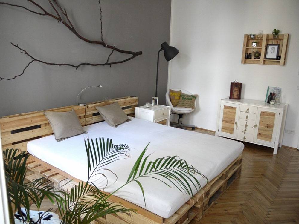Традиционная спальная мебель из паллетов не имеет ножек или колес. В таких вариантах имеется прочный подиум, который ставится непосредственно на пол в помещении.