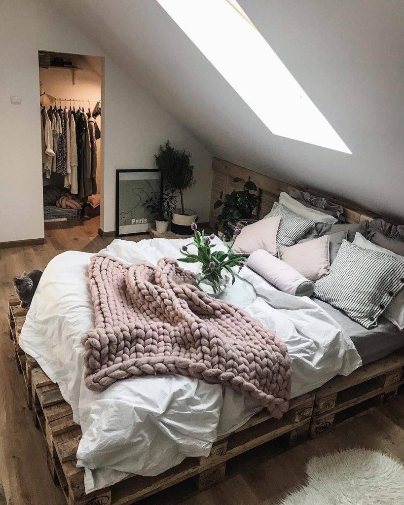 Самое простое спальное ложе можно сделать легко и непринужденно, соединив несколько поддонов и положив большой матрас. Красивым украшением такой кровати станут разнообразные подушки. Очень необычно смотрится такая спальное место вместе с проложенной по низу подсветкой.