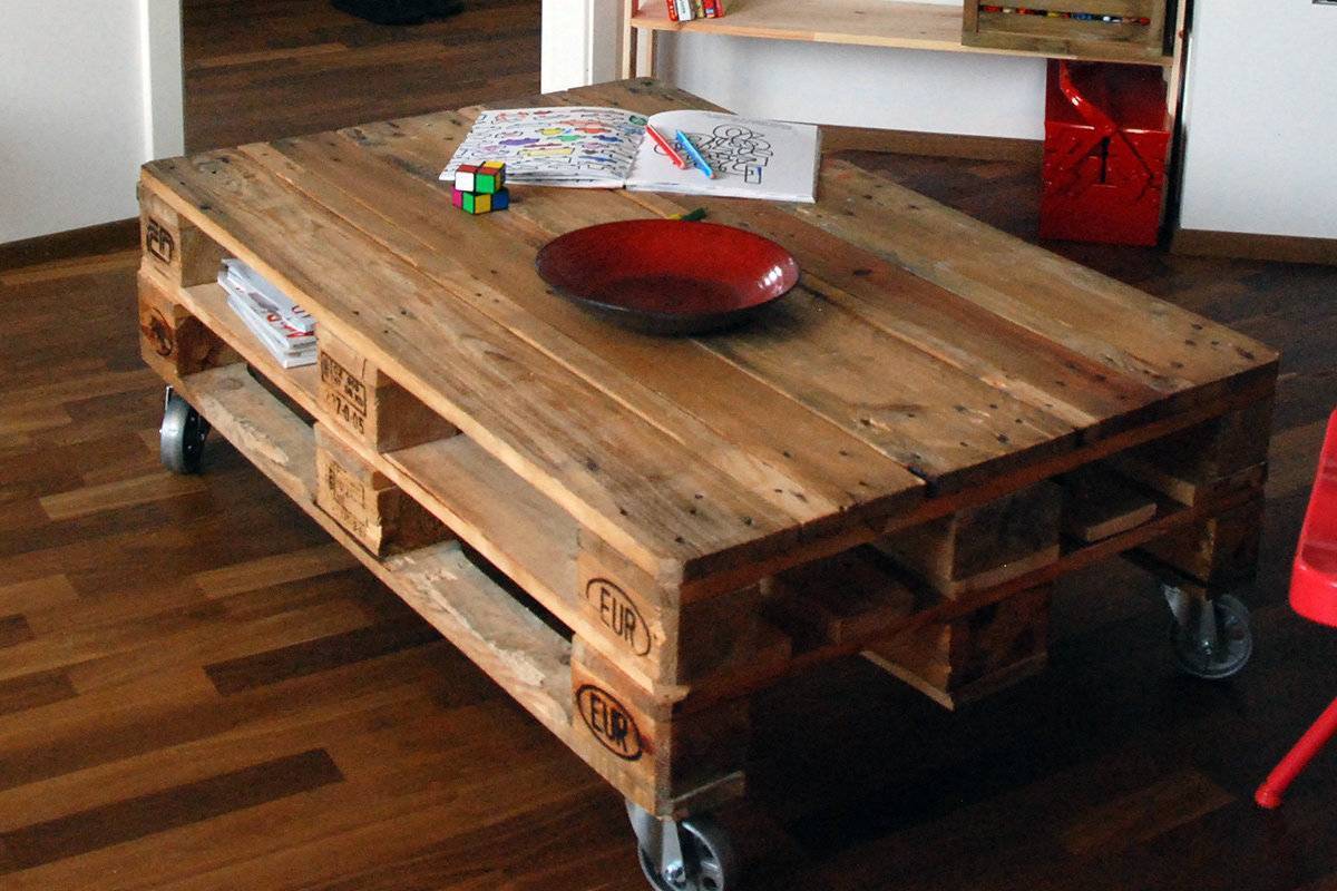 Журнальный столик получится всего из одной или из двух паллет. Для мобильности такой предмет снабжают колесиками, для красоты сверху кладут стекло, а внутренности можно заполнить шишками, разноцветным песком, галькой или ракушками. Или просто постелить под стекло красивый постер.