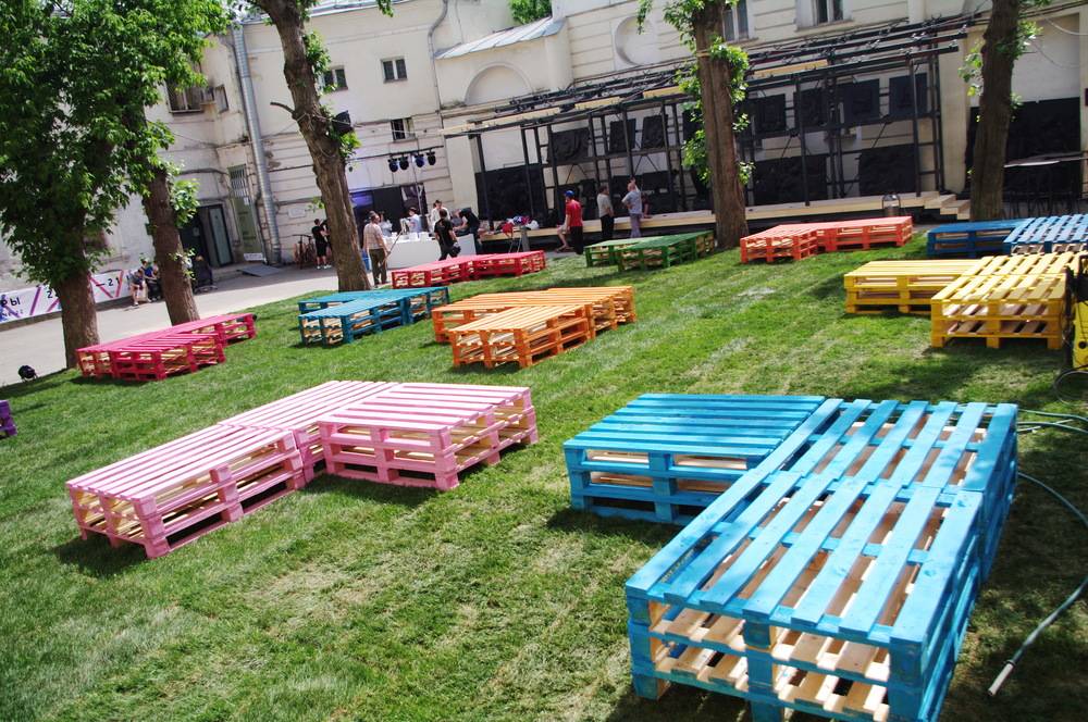 Те, кто шагает в ногу со временем и использует дачу не только для выращивания овощных и плодовых культур, знают, что организовать свой отдых за городом можно с помощью проектора, нескольких хороших фильмов и компании друзей. Обустроить уютное место для просмотра кино можно с помощью поддонов. Для создания трехъярусной кровати понадобится 12 поддонов: основа сбивается и 6 паллет, а высота первого яруса будет равняться высоте одного поддона. Чтобы обустроить второй этаж, к центральной части основы крепят по поддону. Третий этаж потребует последовательного закрепления еще двух слоев паллет. Остается покрасить конструкцию и украсить подушками. Кстати, подобное решение пригодиться и для организации домашнего кинотеатра в условиях помещения.