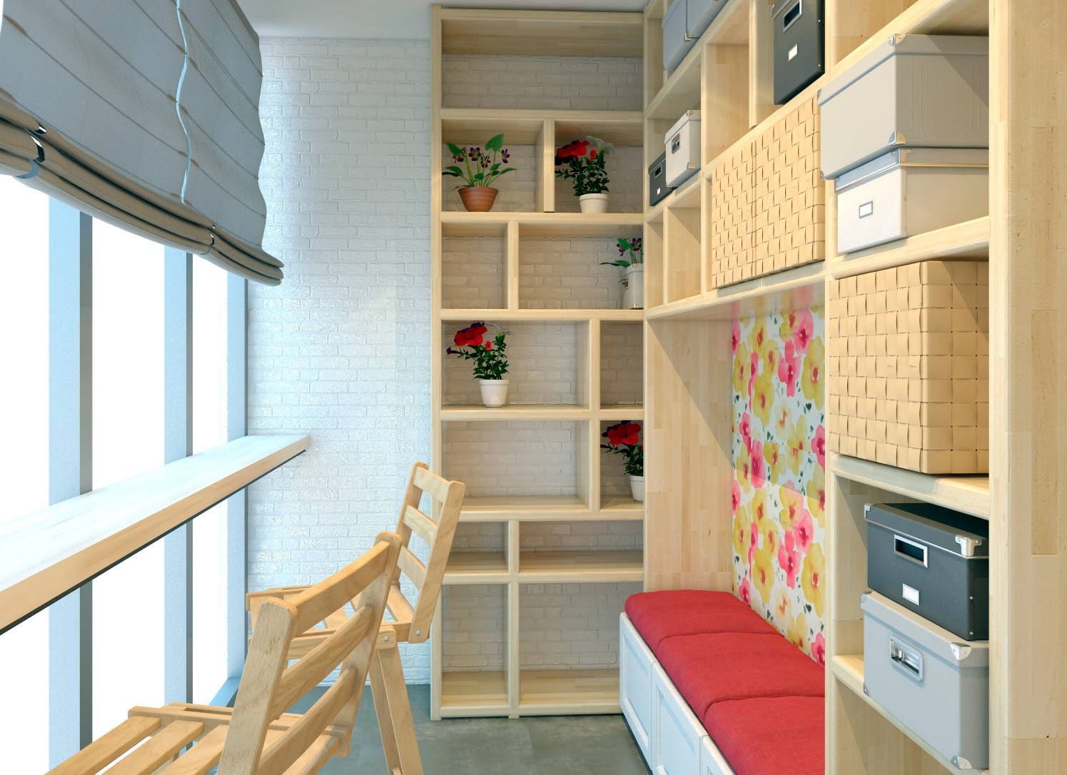 С ящиками. Наиболее практичный вариант, который позволяет по-прежнему хранить на балконе некоторые вещи.
