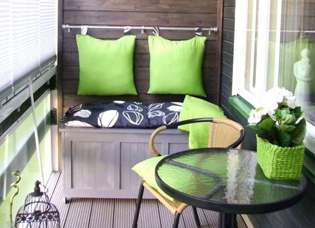 Проще всего оборудовать удобными практичными сидениями торцевую нишу балкона. Обычно делают своими руками двухместный мини-диван или удобный рундук с откидной мягкой крышкой.