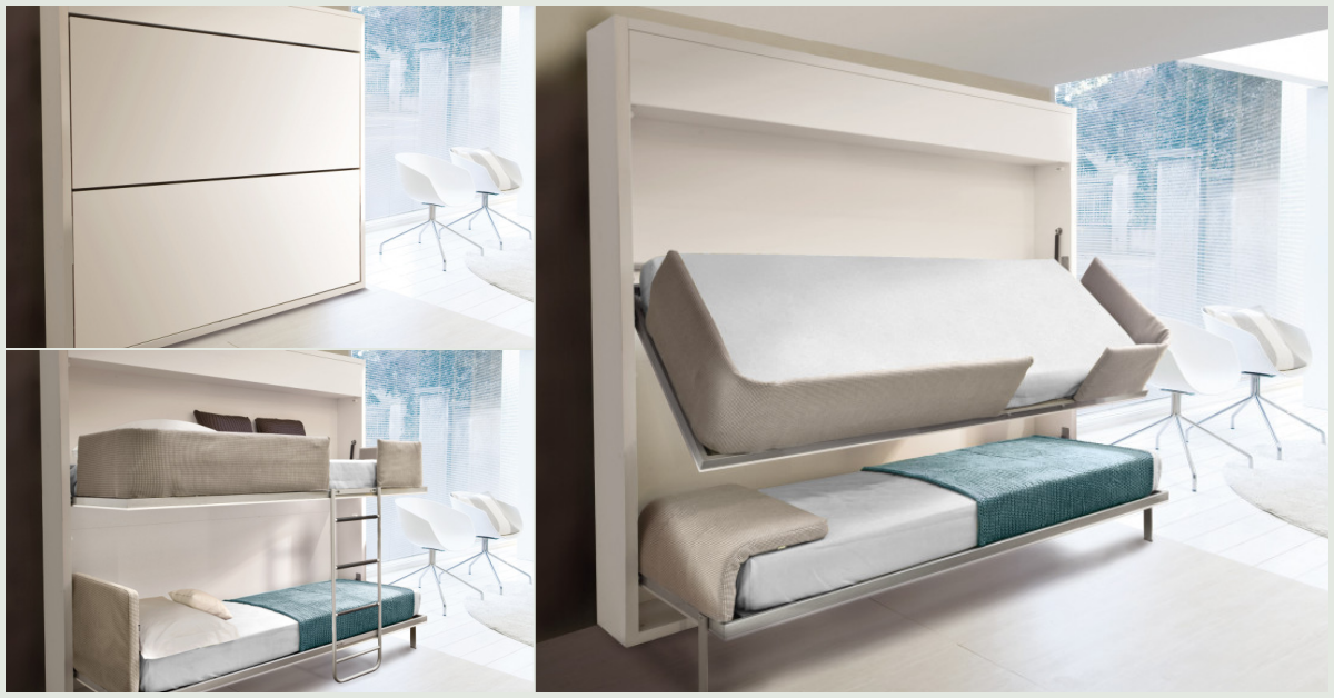 По такому же типу устроены двухъярусные шкафы-кровати. В них два отдельных спальных места располагаются одно над другим. В собранном виде они похожи на шкаф.