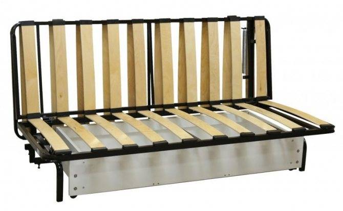 Еще одной особенностью данной модели стал стальной, но достаточно легкий каркас, выгодно отличающийся от громоздкого и тяжелого массива дерева, который используется в других конструкциях. На каркас уложены ламели (гнутые продольные пластины), обычно сделанные из эластичной и прочной древесины бука. Такое основание дает прекрасный ортопедический эффект. Диванный матрас может быть изготовлен с независимыми пружинными блоками, c натуральным латексом или с современными искусственными наполнителями: холлофайбером, пенополиуретаном.