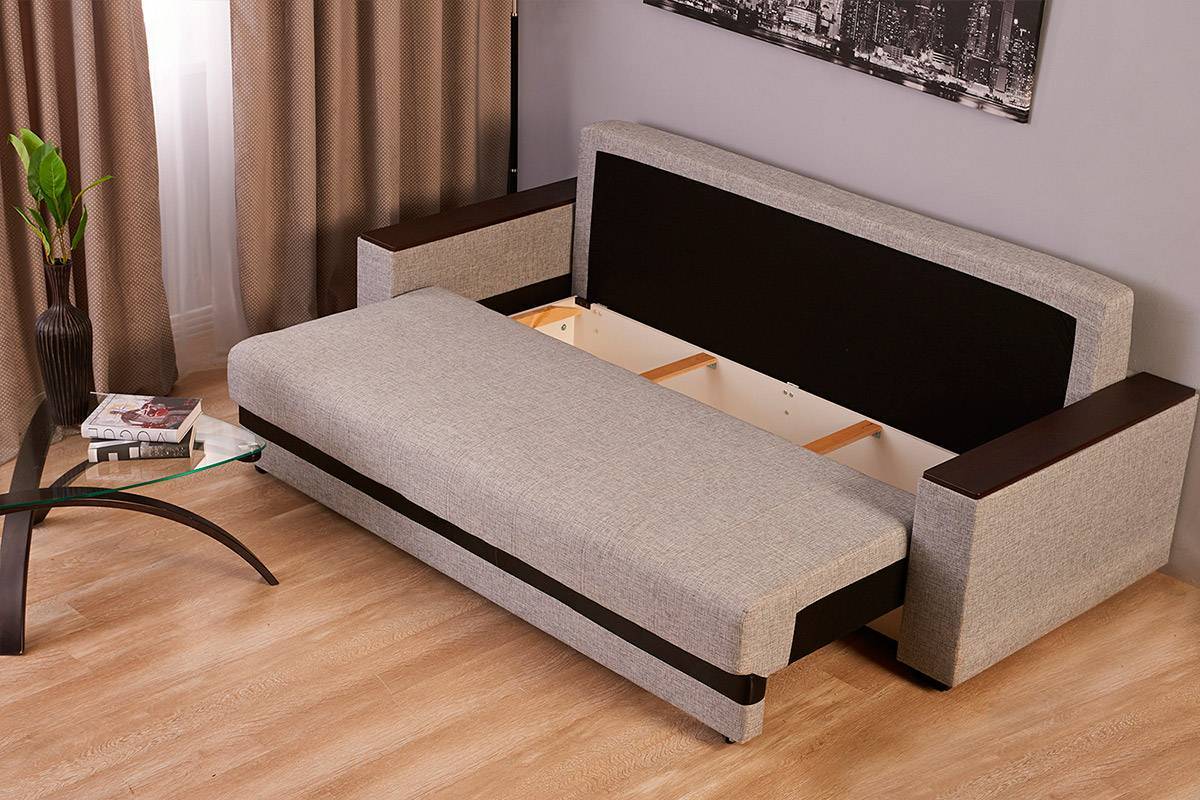 Самый простой вариант, который подразумевает два положения: место для сидения и сна. В разобранном состоянии он образует комфортное двуспальное место и имеет внутренний ящик для постельных принадлежностей.
