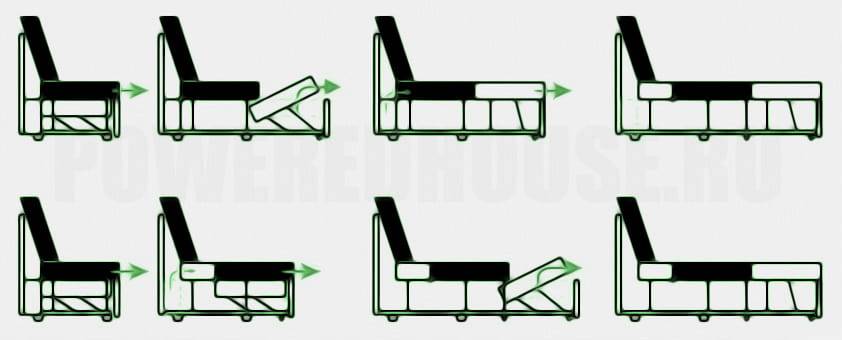 Принцип раскладывания «книжки», но усовершенствованный. Механизм позволяет не только раскладывать его в положение для сна, но и частично откидывать спинку назад, создавая удобное сидение для отдыха.