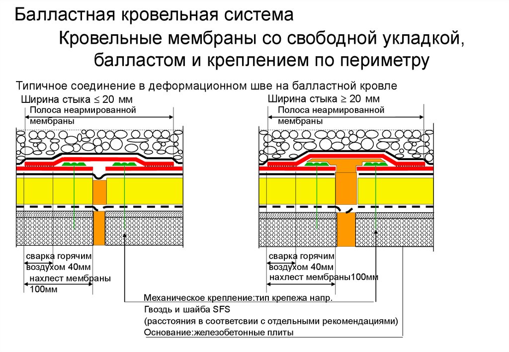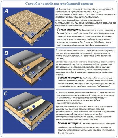 Мембранные полотна могут крепиться тремя основными способами: балластным, клеевым и механическим.