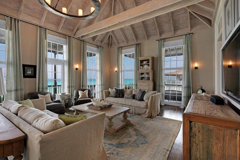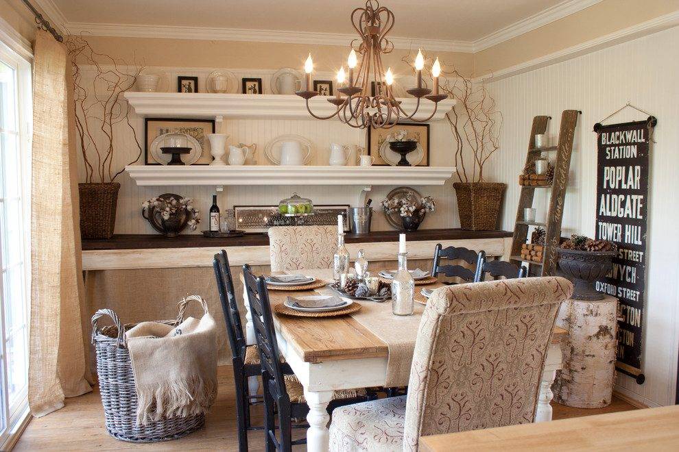 Конечно, дерево. Гостиной в этом стиле необходимо поддерживать репутацию заслуженной комнаты, где выросло не одно поколение домочадцев. Поэтому за деревянной мебелью лучше отправляться в антикварные лавки. Атрибуты стиля – массивный буфет, поскрипывающее кресло-качалка, стеллажи и посудные шкафы с открытыми ящичками, грубоватый стол.